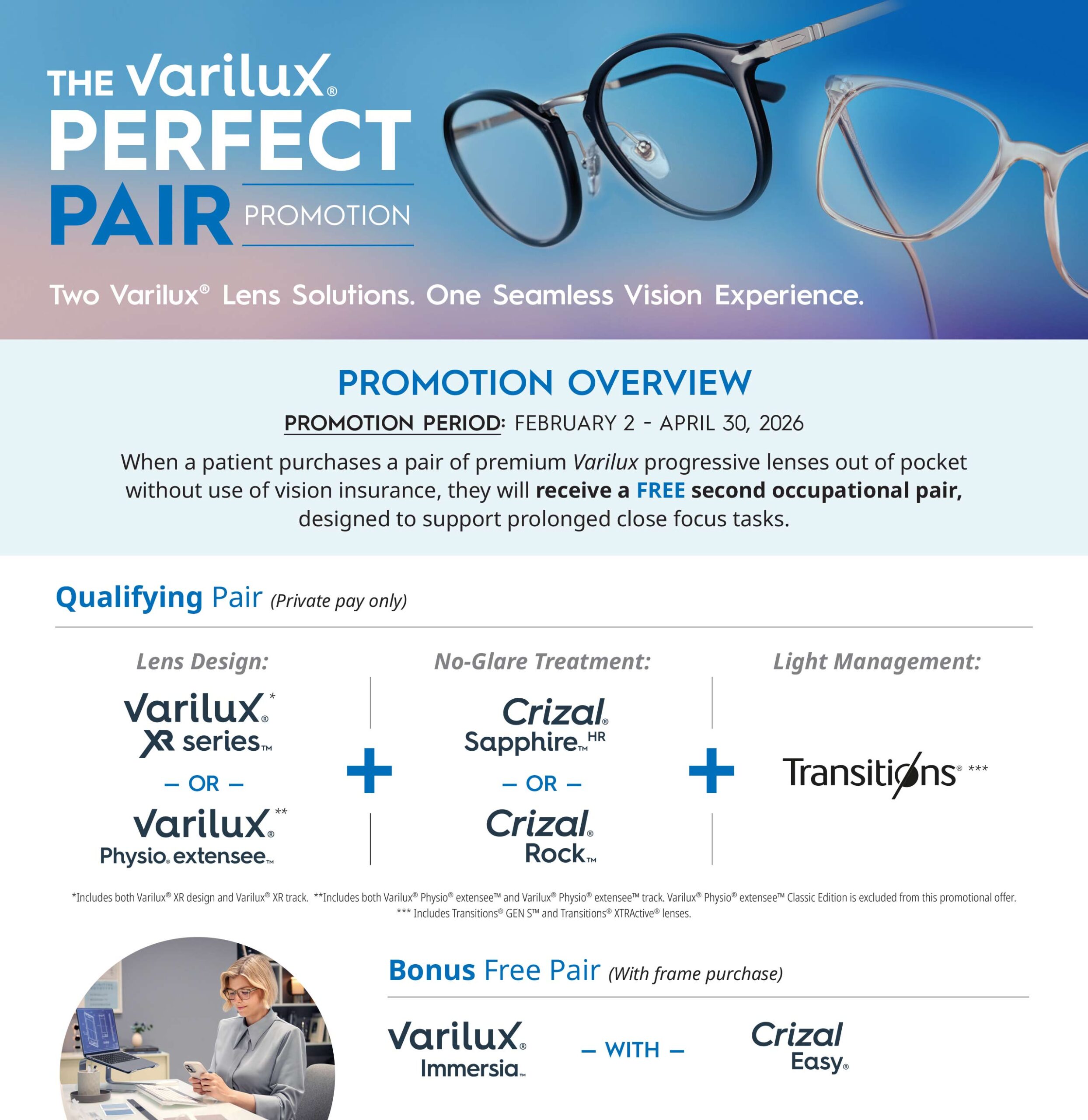 When a patient purchases a pair of premium Varilux progressive lenses out of pocket without use of vision insurance, they will receive a FREE second occupational pair, designed to support prolonged close focus tasks.